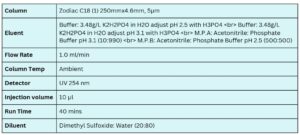 The Zodiac C18 (1) 250mm x 4.6mm, 5µm is a reversed-phase HPLC column used for separating Aciclovir from its related compounds. It uses gradient elution with phosphate buffers and acetonitrile, UV detection at 254 nm, and a 1.0 mL/min flow rate. Ideal for pharmaceutical analysis of Aciclovir and impurities.