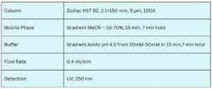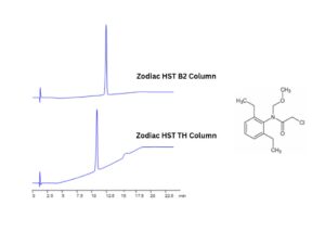 A single multiresidue LC/MS-compatible method was developed using a combination of Zodiac HST B2 and Zodiac HST TH columns to analyze a wide range of pesticides. The Zodiac HST TH column features embedded ionic and hydrophobic groups, allowing precise control and optimization of complex separations. Meanwhile, the Zodiac HST B2 column incorporates embedded basic ion-pairing functionalities, offering strong retention and separation of polar and ionizable compounds.