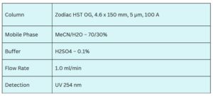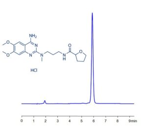 Alfuzosin can be retained and analyzed on a Zodiac HST OG mixed-mode stationary phase column using an isocratic mobile phase of water, acetonitrile (MeCN), and sulfuric acid as a buffer. Detection is performed at 254 nm using UV.