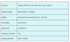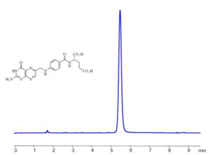 Aminopterin can be analyzed using a Zodiac HST OG column (4.6 × 150 mm, 5 µm, 100 Å) under isocratic conditions with a mobile phase of water, acetonitrile (MeCN), and ammonium formate. Detection methods include UV at 290 nm, ELSD, CAD, and ESI-MS. The Limit of Detection (LOD) varies depending on instrumentation and laboratory conditions.