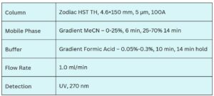 Dapsone is an antibiotic commonly used in the treatment of leprosy and acne. Zodiac HST TH, a trimodal column offering reversed-phase, cation-exchange, and anion-exchange capabilities, was employed for the analysis of dapsone and its related impurities. This method is compatible with both LC/MS detection and preparative chromatography, providing a robust approach for accurate and efficient separation.