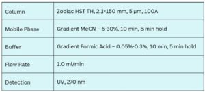 Norfloxacin is a first-generation fluoroquinolone antibiotic effective against both gram-positive and gram-negative bacteria. For analytical purposes, it was retained and separated using the Zodiac HST TH and Zodiac HST RP columns. Zodiac HST TH, with its embedded ionic and hydrophobic groups, provides mixed-mode selectivity, while Zodiac HST RP offers robust reversed-phase performance. This combination ensures precise separation of norfloxacin and its related impurities and is fully compatible with LC/MS detection.