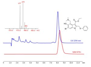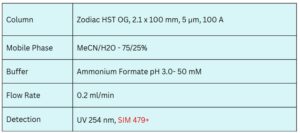 Umifenovir can be retained and analyzed on a Zodiac HST OG mixed-mode stationary phase column using an isocratic mobile phase of water, acetonitrile (MeCN), and ammonium formate as a buffer. Detection is performed at 254 nm using UV, ELSD, or other evaporative detection methods (CAD, ESI-MS).
