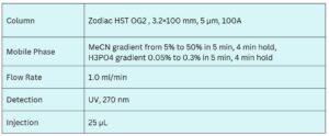 The Zodiac HST OG2 mixed-mode column, designed with embedded acidic ionizable groups, enables effective retention and separation of β-estradiol using reversed-phase mechanisms. This method is compatible with UV detection and offers a reliable approach for analyzing β-estradiol and structurally related estrogenic compounds in pharmaceutical or biological matrices.
