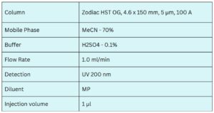 Carbendazim can be retained, separated, and analyzed using a Zodiac HST OG mixed-mode stationary phase column. The analysis follows an isocratic method with a mobile phase of water, acetonitrile (MeCN), and sulfuric acid as a buffer, with UV detection at 200 nm.