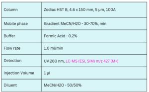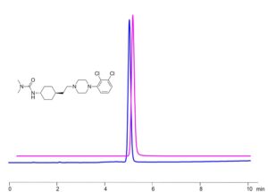 Cariprazine can be accurately retained, separated, and analyzed using the Zodiac HST B mixed-mode stationary phase column. The analysis involves a gradient method with a mobile phase containing water, acetonitrile (MeCN), and formic acid as a buffer. Detection is carried out at UV 260 nm, providing reliable and precise results.