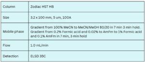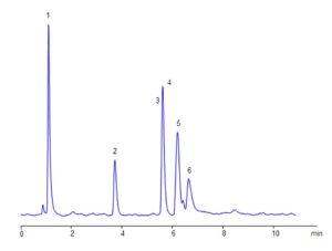 An alternative approach for separating intermediates of the tricarboxylic acid (TCA) cycle was developed using the Zodiac HST HB column, which utilizes hydrogen-bonding as the primary retention mechanism. The organic composition of the mobile phase enhances sensitivity and provides a method fully compatible with LC/MS detection.