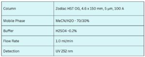 Fluvoxamine can be retained and analyzed using a Zodiac HST OG mixed-mode column with an isocratic mobile phase of water, acetonitrile (MeCN), and sulfuric acid buffer, with UV detection at 252 nm.
