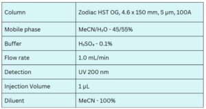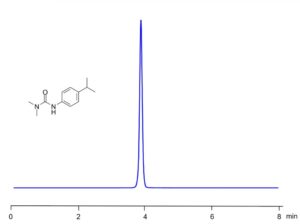 Isoproturon can be retained, separated, and analyzed using a Zodiac HST OG mixed-mode stationary phase column. The analysis follows an isocratic method with a simple mobile phase consisting of water, acetonitrile (MeCN), and sulfuric acid as a buffer, with detection performed using UV at 200 nm.