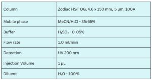 Methionine can be analyzed using a Zodiac HST OG Column with a gradient method and a mobile phase of water, acetonitrile (MeCN), and sulfuric acid. UV detection at 200 nm ensures precise results.