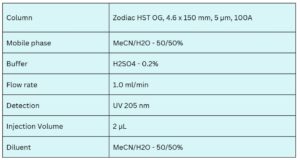 It can be effectively separated and analyzed using a Zodiac HST OG Column with a mixed-mode stationary phase. The isocratic method employs a water, acetonitrile (MeCN), and sulfuric acid mobile phase, with UV detection at 210 nm for accurate results.