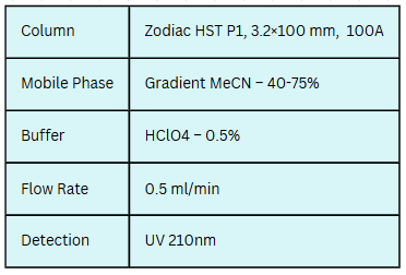 The Zodiac HST P1 column is a high-performance mixed-mode analytical column featuring embedded aromatic and acidic ion-pairing groups on a short carbon chain.