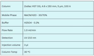 It can be retained and analyzed using a Zodiac HST OG mixed-mode column with an isocratic method utilizing a mobile phase of water, acetonitrile (MeCN), and sulfuric acid buffer. Detection is performed using UV at 210 nm.