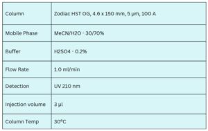 It can be retained and analyzed using a Zodiac HST OG mixed-mode column with an isocratic method (water, MeCN, sulfuric acid buffer) and UV detection at 210 nm.