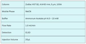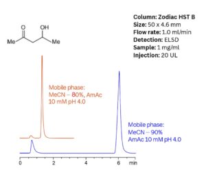 Valproic acid is a chemical compound commonly used as an anticonvulsant and mood-stabilizing drug. It is a hydrophobic molecule containing a carboxylic acid functional group, which influences its chromatographic behavior. On the Zodiac HST B2 mixed-mode column, valproic acid is effectively retained through a combination of reversed-phase and anion-exchange interactions.