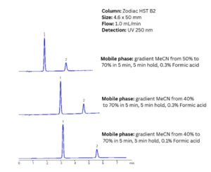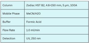 Zearalenone and Ochratoxin A are toxic mycotoxins frequently detected in grains and various food products. These compounds were successfully separated using the Zodiac HST B2 mixed-mode column, operating in reversed-phase anion-exchange mode. The retention times of both analytes can be effectively controlled by adjusting the concentrations of acetonitrile and buffer in the mobile phase.