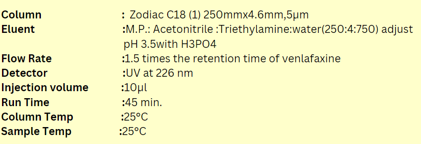 It seems like you’re referring to an assay method for Venlafaxine Hydrochloride capsules using a Zodiac C18 column. This method likely involves high-performance liquid chromatography (HPLC),This outline provides a structured approach to developing and using an HPLC method for the assay of Venlafaxine Hydrochloride capsules using a Zodiac C18 column. Adjustments may be necessary based on specific requirements and equipment available in your laboratory.