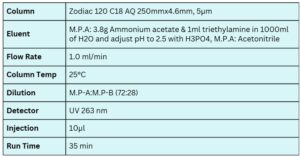 The Zodiac 120 C18 AQ column is a versatile tool for reversed-phase HPLC, offering excellent stability and performance in both aqueous and organic solvents, making it ideal for a wide range of applications in analytical chemistry.
