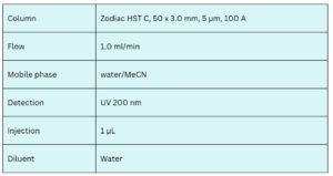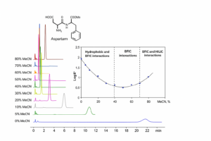 The effect of varying the acetonitrile percentage in the mobile phase is illustrated using a Zodiac HST C HPLC column in a Buffer-Free Ion Chromatography (BFIC) separation. As the acetonitrile content decreases, the retention time of the artificial sweetener Aspartame initially decreases and then increases. TThis shift indicates a transition in the retention mechanism—from a combination of hydrophobic and BFIC (Buffer free ion chromotography)interactions, to BFIC alone, and eventually to a mix of BFIC and hydrophilic interaction liquid chromatography (HILIC) mechanisms. Aspartame consists of two amino acids, aspartic acid and phenylalanine, in the form of an ethyl ester. The separation was achieved using mobile phases composed of water and acetonitrile (MeCN or ACN), with ultraviolet (UV) detection.