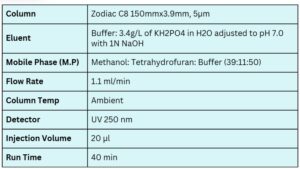 The Zodiac C8 column features a C8 (octyl) bonded silica stationary phase, optimized for reversed-phase chromatography. With a 5 µm particle size, it ensures high resolution and efficient separation of Bortezomib and related compounds.