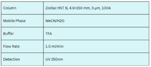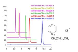 The Zodiac HST B column efficiently separates tertiary amines like cetylpyridinium with excellent peak symmetry through a combination of reversed-phase and ion-exclusion mechanisms. Its embedded basic functional group shields underlying silanols, minimizing peak tailing. Retention can be finely adjusted by varying either the organic content or the acid concentration in the mobile phase—something not typically achievable with standard C18 reversed-phase columns. This method uses a mass spectrometry-compatible mobile phase of water, acetonitrile (MeCN, ACN), and trifluoracetic acid (TFA), with UV detection at 250 nm.