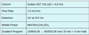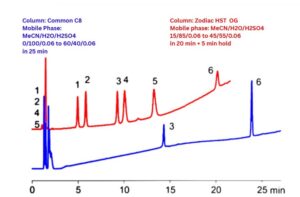 This application highlights the advantage of gradient elution on a mixed-mode Zodiac HST OG column compared to a traditional single-mode C8 column. While the C8 column successfully separated only the polar compounds (#3 and #6), the non-polar compounds co-eluted with minimal resolution. Achieving comparable separation on the C8 column would require the addition of ion-pairing reagents to the mobile phase. In contrast, the Zodiac HST OG mixed-mode column effectively separates both polar and non-polar compounds without the need for such additives, demonstrating its superior versatility and efficiency in complex mixture analysis.