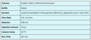 A robust and reliable HPLC method designed for the analysis of DexLansoprazole Hydrochloride Jelly using the Zodiac C18(1) column (150mm × 4.6mm, 5µm). This method ensures high precision, superior resolution, and consistent performance, making it well-suited for pharmaceutical quality control and impurity assessment.