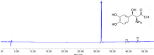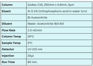 The Zodiac C18 column is equipped with a C18 stationary phase that ensures effective separation of Droxidopa (moderately polar) and its unknown impurities. The column length of 250 mm and 5 µm particle size provide high separation efficiency and resolution, allowing for the detection of trace impurities.