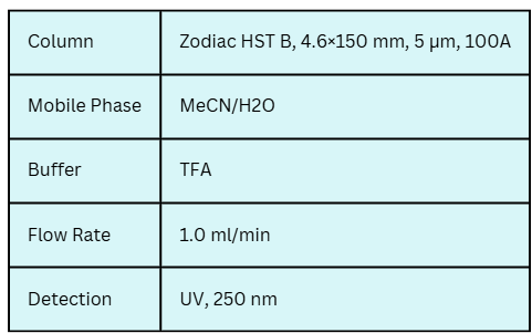 The Zodiac HST B column combines hydrophobic reversed-phase and ion-exchange mechanisms to separate diacids such as fumaric, benzoic, phthalic, naphthoic, and maleic acids. Adjusting the acetonitrile content in the mobile phase reverses the peak order of naphthoic and maleic acids. The method uses a mobile phase of water, acetonitrile (MeCN), and trifluoroacetic acid (TFA) with UV detection at 250 nm for precise separation.