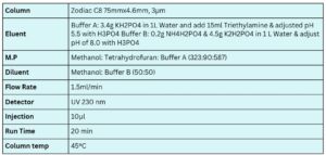 Duloxetine HCL, an antidepressant, is commonly analyzed using a Zodiac C8 column in chromatography. The C8 column’s specific properties aid in the efficient separation of Duloxetine HCL and related compounds, providing a reliable method for pharmaceutical analysis. This chromatographic approach on the Zodiac C8 column ensures accurate identification and quantification, contributing to the understanding of Duloxetine HCL’s pharmaceutical profile and quality control processes.