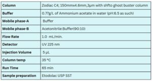 A robust HPLC method for the analysis of Etodolac using the Zodiac C4 column. This method ensures high sensitivity, precise separation, and excellent peak resolution, making it ideal for pharmaceutical quality control and formulation studies.