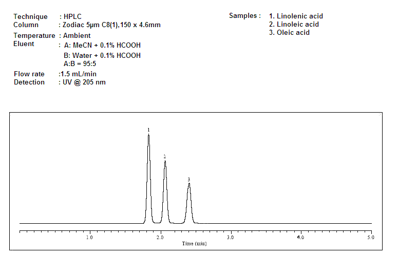 Column Name : Zodiac C8(1)Compound Name : Linolenic acid , Linoleic acid, Oleic acidGet in Touch!! I agree that my submitted data is being collected and stored.Get Your Quote or Call: 040-29881474We focus on supporting laboratory workflows & optimizing lab-wide operationsContact us