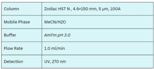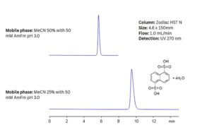 Naphthalenedisulfonic acid is effectively retained on the Zodiac HST N mixed-mode HILIC/anion-exchange column through an anion-exchange mechanism. The retention time is primarily influenced by the concentration of counter-ions in the mobile phase. This method delivers excellent peak shape and tunable retention, making it a robust solution for quantifying various sulfonic acids across different sample matrices.