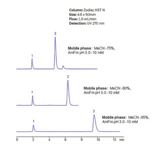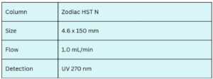 This HPLC method separates betaine and carboxymethylcysteine using a mixed-mode HILIC/ion-exchange mechanism. Both compounds are highly hydrophilic and exhibit poor retention on traditional reversed-phase columns. On the Zodiac HST N column, separation is achieved through a combination of hydrophilic interaction and ionic exchange. Operating in HILIC mode with Zodiac HST N allows for lower organic solvent concentrations, improving analyte solubility and enhancing method robustness. This approach is suitable for both qualitative and quantitative analysis of betaine and carboxymethylcysteine using ELSD or LC/MS detection.