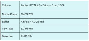 Unlike conventional HILIC columns, the Zodiac HST N features embedded acidic and basic ionizable groups, enabling dual-mode interaction — ion exchange and hydrophilic partitioning. This allows efficient separation with lower acetonitrile content in the mobile phase. The method is compatible with ELSD, LC/MS, UV, and Corona CAD detection techniques.