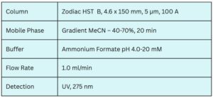 Climbazole can be retained and analyzed using a Zodiac HST B mixed-mode stationary phase column. The method employs an gradient elution with a mobile phase consisting of water, acetonitrile (MeCN), and ammonium formate as a buffer. Detection is carried out using UV at 270 nm.