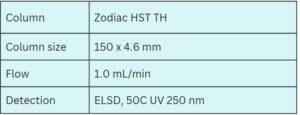 The method is compatible with various detection techniques such as ELSD, UV, CAD, and LC/MS, ensuring robust and reliable quantitation. The Zodiac HST TH column retains ionizable compounds without the need for ion-pairing reagents, making it an excellent universal platform for analyzing basic and acidic drugs and their corresponding counter-ions.