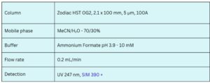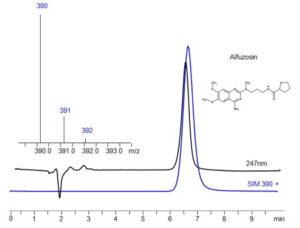 Alfuzosin can be effectively retained and analyzed using a Zodiac HST OG2 mixed-mode column. The analysis uses an isocratic method with a mobile phase composed of water, acetonitrile (MeCN), and ammonium formate. Detection can be performed using UV at 247 nm, ELSD, CAD, ESI-MS, or other evaporative-based detection methods.