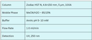 Sodium azide, a highly toxic compound, has been widely used in older automotive airbag systems and aircraft escape slides. The Zodiac HST N mixed-mode column effectively retains the azide ion using an LC/MS-compatible mobile phase composed of acetonitrile (ACN), water, and ammonium acetate as a buffer. This method also allows for UV detection at 250 nm.