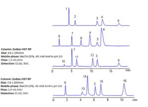 Retention time and selectivity can be finely tuned by adjusting the acetonitrile concentration and ionic strength of the mobile phase. Depending on the UV absorbance properties of the counter-ions, ELSD (Evaporative Light Scattering Detection) can be used—especially when the counter-ion forms a non-volatile salt with additives like ammonium formate.