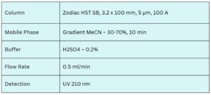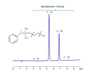 Benzalkonium chloride, also known as Zephiran or Alkyldimethylbenzylammonium chloride, is a positively charged surfactant commonly used as a pharmaceutical preservative and antiseptic. Benzalkonium chloride can be retained on a Zodiac HST SB mixed-mode stationary phase column with embedded strong basic ion-pairing groups. The analysis employs a gradient method with a mobile phase consisting of water, acetonitrile (MeCN), and sulfuric acid (H2SO4) as an ionic modifier. This method allows for UV detection at 210 nm, providing high resolution and excellent peak symmetry.