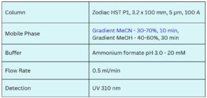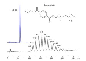Benzonatate is a medication commonly used to relieve cough, belonging to the class of antitussives. It works by numbing the throat and lungs, reducing the cough reflex. It is primarily used to suppress coughing caused by conditions like respiratory infections or airway irritation. Benzonatate can be retained and analyzed using a Zodiac HST P1 mixed-mode stationary phase column. The analysis employs an isocratic method with a simple mobile phase consisting of water, acetonitrile (MeCN), and ammonium formate as a buffer. This method allows for detection using UV at 310 nm.