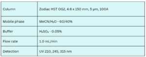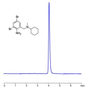 Using the Zodiac HST OG2 mixed-mode column, Bromhexine can be effectively retained, separated, and analyzed under isocratic conditions. The method utilizes a 60:40 mixture of acetonitrile and water, with 0.05% phosphoric acid as a buffer. The analyte is detected using UV at 210, 245, and 315 nm, offering multiple points of sensitivity. This setup provides sharp peak resolution, ensuring accurate and efficient quantification of Bromhexine in pharmaceutical or clinical formulations.