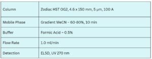 It can be effectively retained, separated, and analyzed using a Zodiac HST OG2 mixed-mode column. The method employs a gradient elution with a mobile phase consisting of water, acetonitrile (MeCN), and formic acid (FA) as the ionic modifier. Detection can be performed in the low UV range at 270 nm, or alternatively using ELSD, CAD, or ESI-MS.