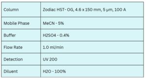 D-Panthenol (Provitamin B5) and Histidine are key ingredients in skincare and health products, offering moisturizing, soothing, and protective benefits. For their separation and analysis, the ZODIAC HST OG column is highly effective. This mixed-mode stationary phase column provides excellent retention and separation of these compounds, ensuring precise analysis. The method utilizes an isocratic mobile phase with water, acetonitrile (MeCN), and sulfuric acid as a buffer, with UV detection at 200 nm. The ZODIAC HST OG column is particularly suited for compounds like D-Panthenol and Histidine, allowing for efficient separation based on their distinct chemical properties.