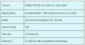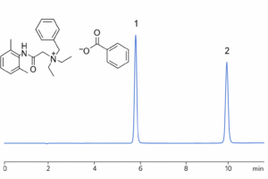 Denatonium Benzoate is the most bitter compound ever discovered, with several applications, including denaturing ethanol, mimicking the bitter taste of certain pills, and serving as a biochemical warning to prevent the consumption of harmful substances such as methanol, acetone, and paint. Denatonium Benzoate can be separated and retained on a Zodiac HST SB mixed-mode stationary phase column with embedded strong basic ion-pairing groups. The analysis utilizes a gradient method with a mobile phase consisting of water, acetonitrile (MeCN), and ammonium formate (AmFm) as an ionic modifier. This method allows for UV detection at 260 nm with high resolution and peak symmetry and is compatible with Mass Spectrometry (MS), ELSD, and CAD.