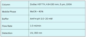 The Zodiac HST TH column is employed to retain DCNA and separate it effectively from impurities. With embedded ionic and hydrophobic groups, the column enables mixed-mode interactions, allowing for precise and efficient separation of compounds with varying chemical properties. The method is fully LC/MS compatible and provides a robust approach for the analysis of DCNA and similar fungicides.