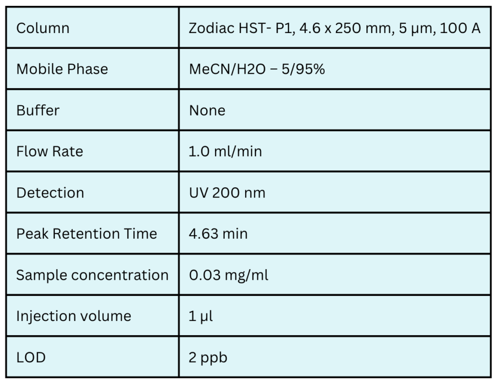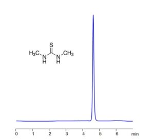 Dimethylthiourea (DMTU), with the chemical formula (CH3)2NCSNH2, is a compound used in research due to its properties as a hydrogen bond donor and acceptor. It is employed in reactions as a reducing agent and has applications in electrical conductivity and radiation absorption. For its analysis, the Zodiac HST P1 mixed-mode column can be used with a mobile phase consisting of water and Acetonitrile (MeCN), with no buffer. This simple mobile phase allows for effective retention and separation of DMTU. UV detection at 200 nm can be employed for accurate quantification. The limit of detection (LOD) may vary depending on the laboratory and instrument used. This method provides high resolution and efficient analysis of Dimethylthiourea.