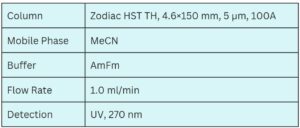 Components of Tylenol Cold and Cough Remedy were successfully separated using the Zodiac HST TH mixed-mode column. The method enables analysis of neutral (acetaminophen), basic (chlorpheniramine, dextromethorphan, pseudoephedrine), and acidic (maleic acid/maleate) compounds with excellent peak shape and retention control. This approach is suitable for quantitative analysis in formulations like Advil, Tylenol, Dimetapp, Robitussin, NyQuil, and others, and is applicable in production, QA/QC, and biological studies.