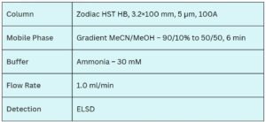 Ethephon can be retained and separated using the Zodiac HST HB column, which operates on a hydrogen-bonding separation mechanism. Retention is modulated by adjusting the methanol content in the mobile phase, which helps suppress excessive hydrogen bonding, allowing precise control over analyte retention.
